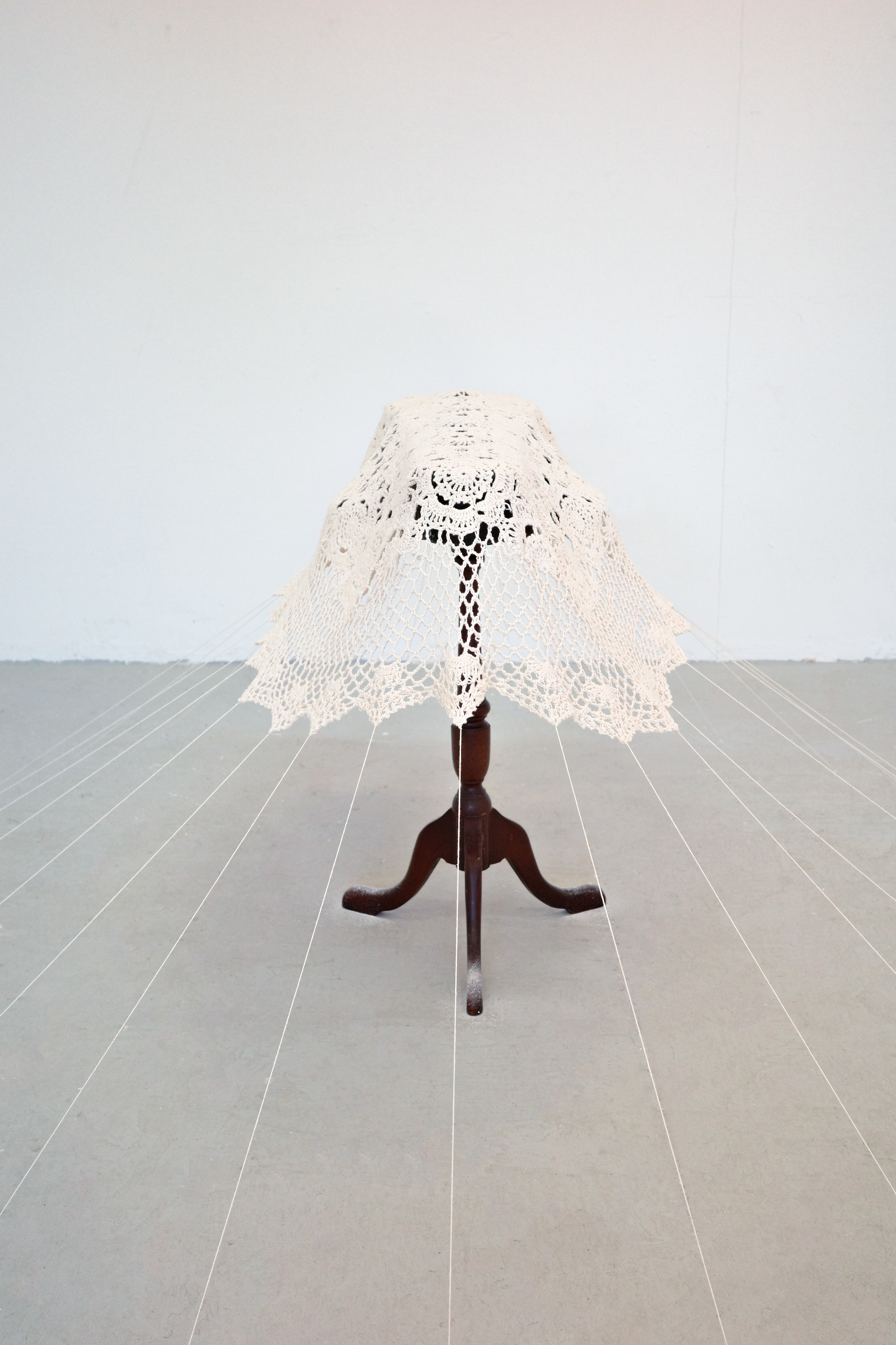 Round table, crochet, cotton thread, violin case, rosin dust and audio